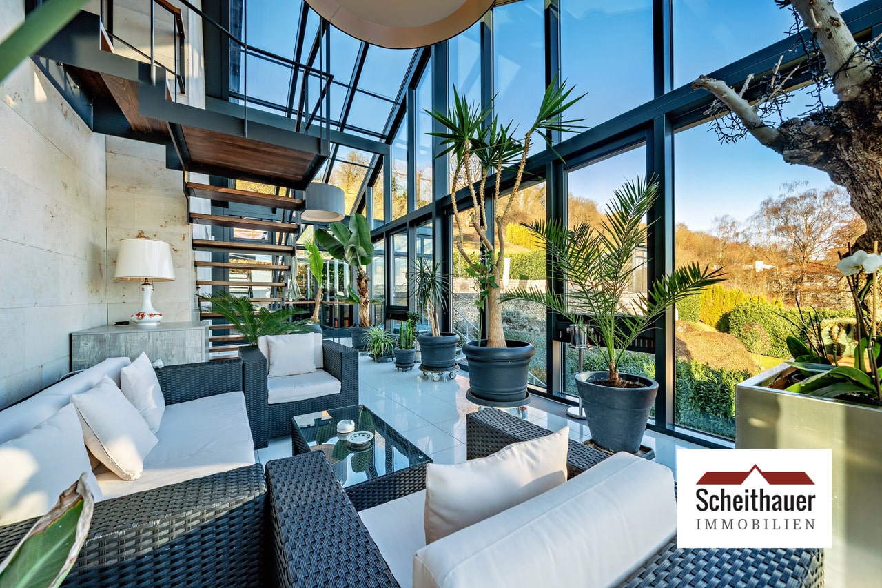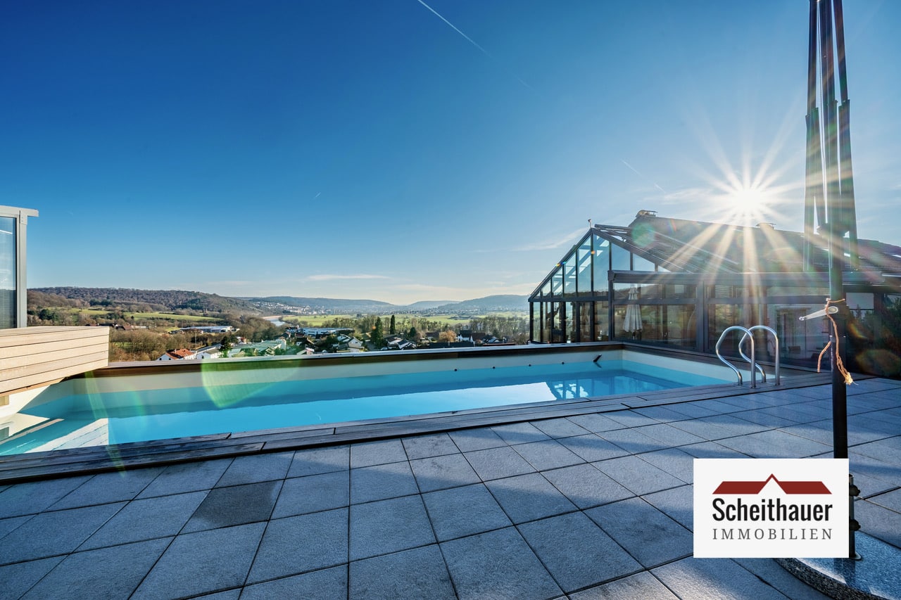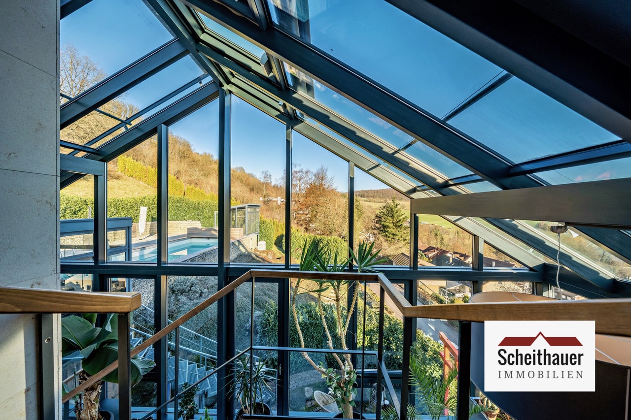 Ein besonderes Highlight ist der Infinity-Pool, der scheinbar mit der Landschaft verschmilzt und einen spektakulären Blick über das Neckartal freigibt. Die großzügige Terrasse rund um den Pool wird durch einen kleinen Wintergarten direkt am Pool ergänzt.