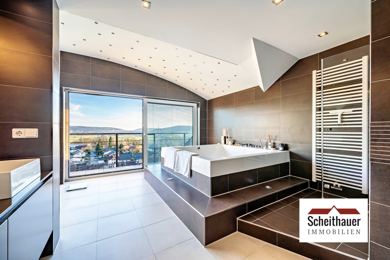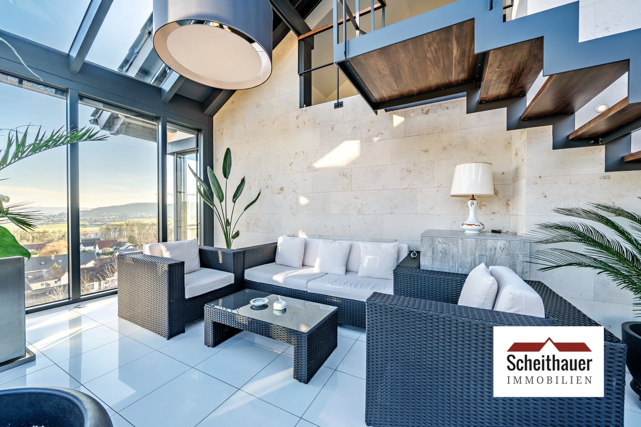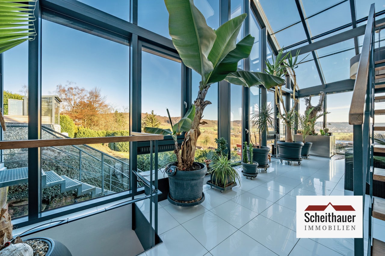 Ein besonderes Highlight ist der Infinity-Pool, der scheinbar mit der Landschaft verschmilzt und einen spektakulären Blick über das Neckartal freigibt. Die großzügige Terrasse rund um den Pool wird durch einen kleinen Wintergarten direkt am Pool ergänzt.