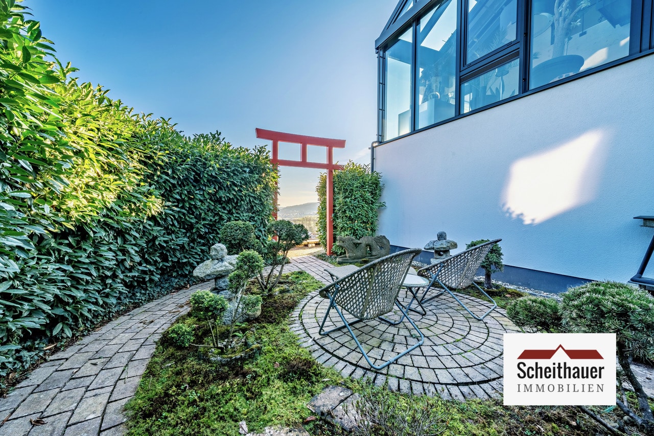 Der Außenbereich dieses Anwesens ist ebenso außergewöhnlich wie das Gebäude selbst. Neben den großzügigen Terrassenflächen wurde ein liebevoll angelegter Japanischer Garten geschaffen, der dem Grundstück eine besondere Atmosphäre der Ruhe und Ausgeglichenheit verleiht. Mit seiner klaren Gestaltung, harmonischen Formen und sorgfältig ausgewählten Pflanzen bietet er einen einzigartigen Ort der Entspannung und einen stilvollen Kontrast zur Weite des Neckartals.