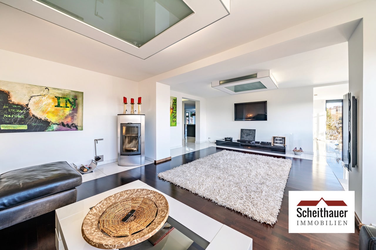 Bereits beim Betreten der Hauptwohnung wird deutlich, dass hier Wert auf Raum, Licht und Blickachsen gelegt wurde. Große Fensterflächen holen die umliegende Landschaft ins Innere und schaffen eine beeindruckende Verbindung zwischen Architektur und Ausblick.