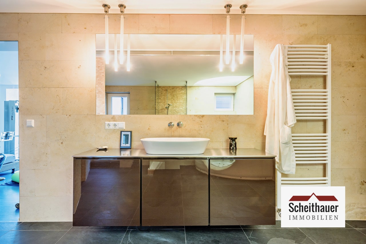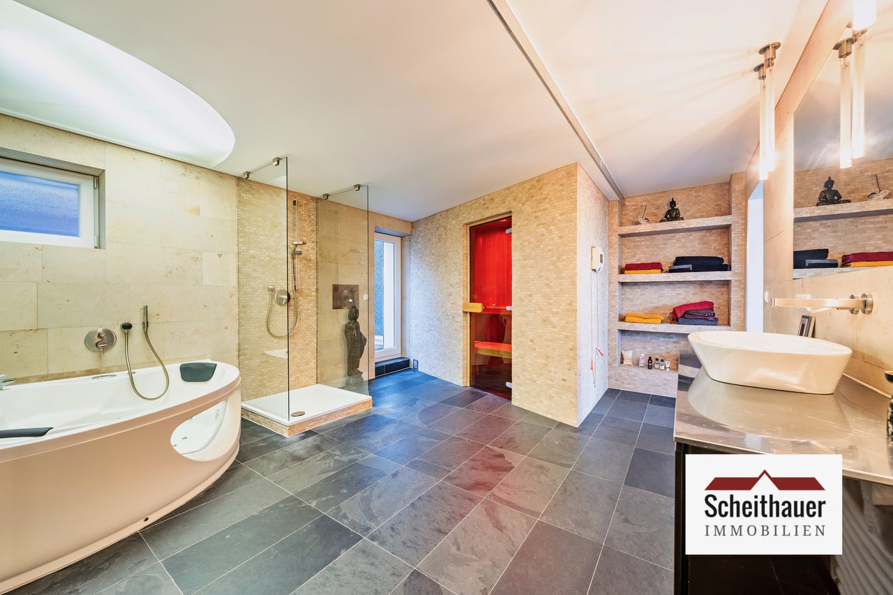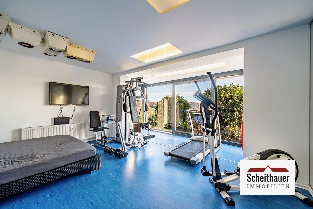 Im Untergeschoss eröffnet sich ein exklusiver Rückzugs- und Wellnessbereich. Eine hochwertige Saunalandschaft mit Whirlpool, Dusche und WC, ein separates Fitnessstudio, ein ruhiges Arbeitszimmer sowie ein außergewöhnlicher Weinkeller mit italienischen Ziegelsteinen, professioneller Temperaturregelung und Lüftung unterstreichen den luxuriösen Charakter dieses Hauses.