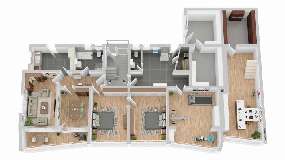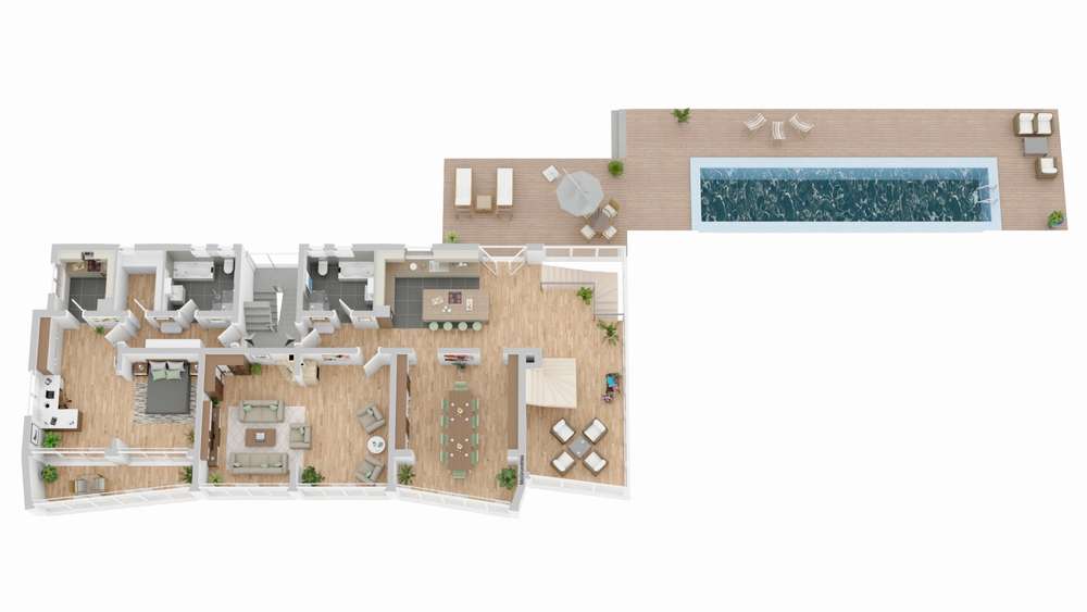 Neben der großzügigen, eigengenutzten Hauptwohnung umfasst das Haus drei weitere Wohneinheiten. Eine Wohnung im Untergeschoss mit ca. 94,23 m² ist aktuell vermietet. Im Erdgeschoss befindet sich eine ca. 56,93 m² große Gästewohnung, während eine weitere Einheit im Obergeschoss mit ca. 53,01 m² derzeit leersteht und flexibel nutzbar ist. Das Herzstück der Immobilie bildet jedoch die außergewöhnlich großzügige Hauptwohnung mit ca. 306,98 m² Wohnfläche, verteilt über alle Etagen des Hauses und ergänzt durch eine weitläufige Terrasse mit Pool.