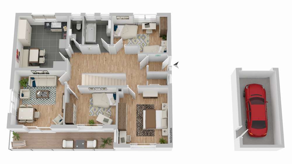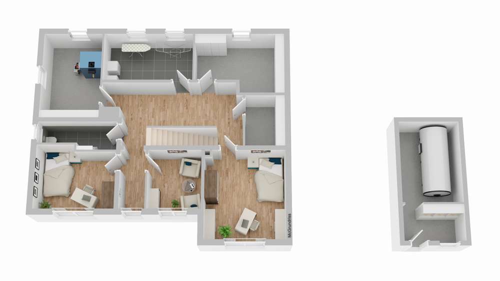 Mit rund 120 m² Wohnfläche im Erdgeschoss bietet das Haus komfortables Wohnen auf einer Ebene. Hinzu kommt eine Einliegerwohnung im Untergeschoss mit ca. 75 m² sowie eine Ausbaureserve im Dachgeschoss mit rund 79,5 m². Damit eignet sich die Immobilie sowohl für Familien mit Platzbedarf als auch für Mehrgenerationenwohnen oder Wohnen und Arbeiten unter einem Dach.
